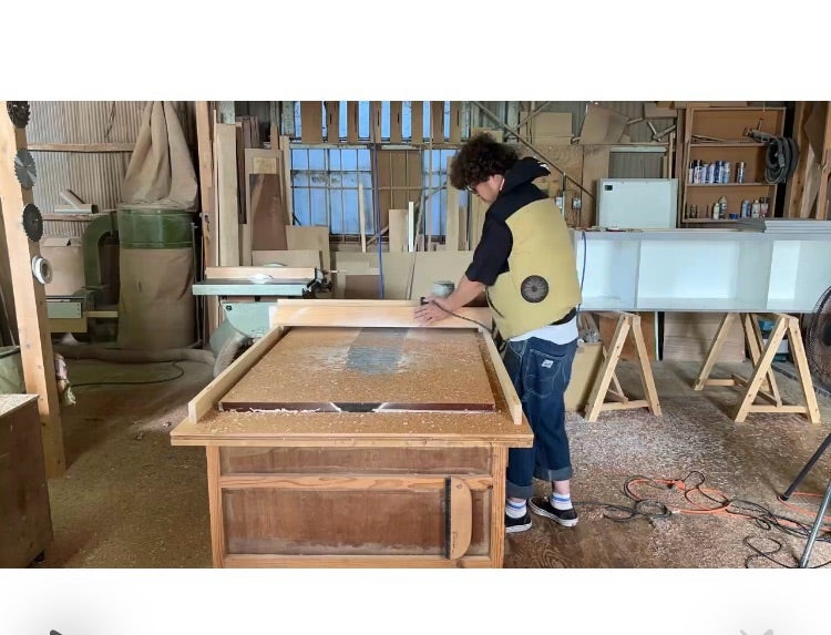 皆さんこんばんは! 火曜日担当ですが遅れてしまいました! 岡田です! 今回はテーブル作りの一コマの写真です レジンテーブルの面を削ってる