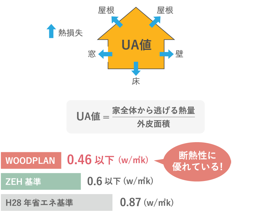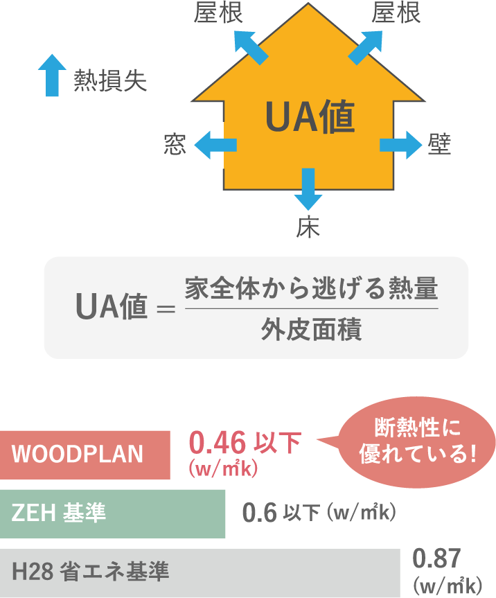 物全体を通して損失する熱量を表しているのがUA値(Q値)。数値が低い程、断熱性能に優れた住まいと言えます。WOODPLANではUA値0.23~0.46の高断熱の高い性能を保ち、快適な温度がずっと変わらない家づくりを目指しています。