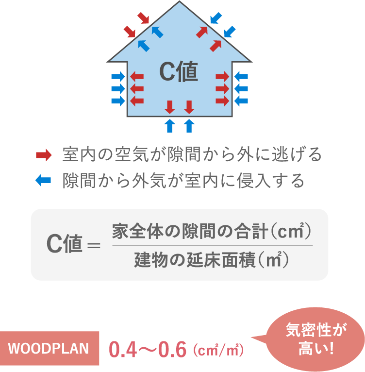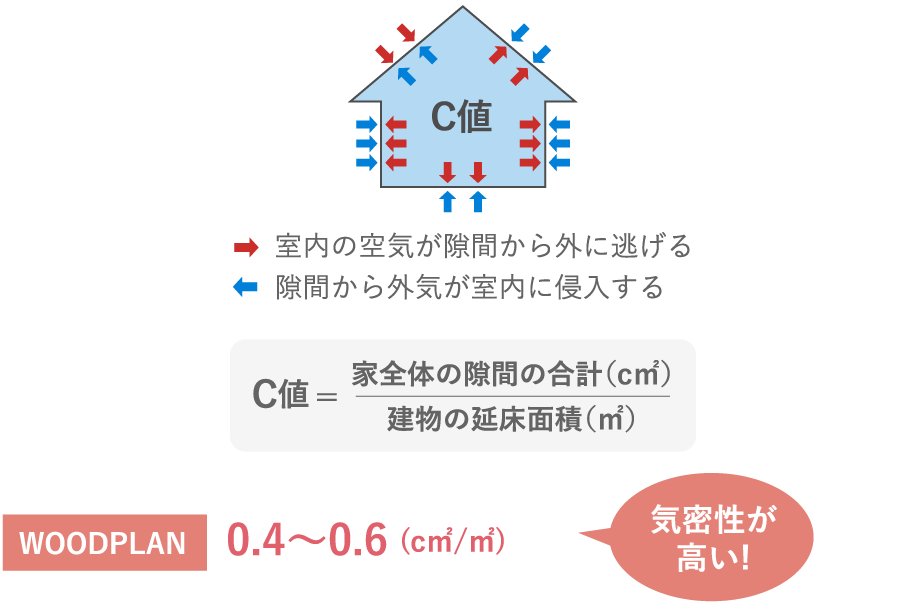 住宅の気密性は「C値」という実際に測る指標で表されます。C値は床面積1m²あたりの隙間面積(cm²)で示され、数字がゼロに近いほど隙間の少ない“高気密な家”と言えます。お施主様からのご希望により気密測定を行っています。WOODPLANの施工実績の値は、C値0.4~0.6(cm²/m²)。(※G3仕様含む、性能重視の大手ハウスメーカー様と同等の気密値です。)すき間が少なければ少ないほど外気温や湿度の影響を受けにくく光熱費もお安くなります。