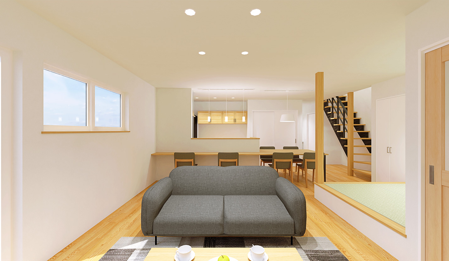 Natureは、LDKを中心に空間を構成し、家族の動きやすさと暮らしやすさを両立した住まいです。