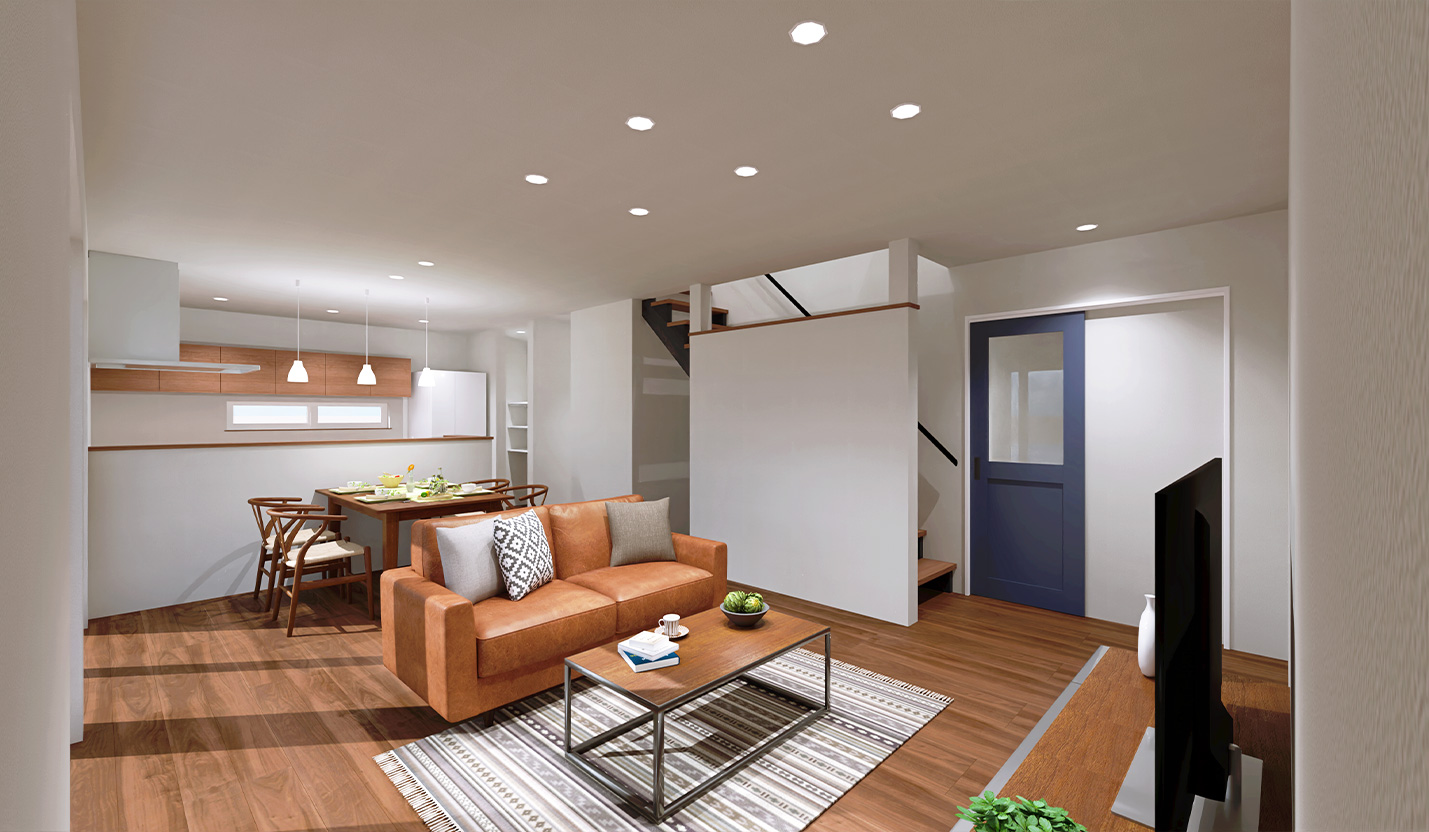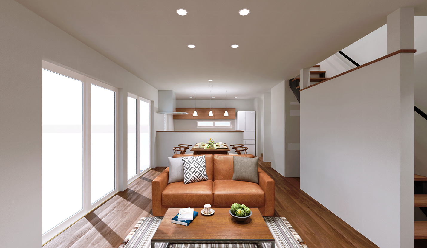 リビング階段を採用した開放的なLDKは、家族が自然と顔を合わせ、コミュニケーションが生まれる空間設計。