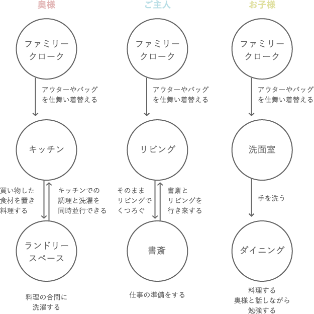 快適な家には、快適な動線があります。さまざまな機能を持った部屋があるだけでは、快適な家ではありません。そこにライフスタイルが落とし込まれた無駄のない動線が必要です。家庭によって毎日の動線は当然違います。それぞれがぞれぞれに快適な毎日を過ごすために、小さなストレスをうまない工夫が散りばめられて、プランニングされています。