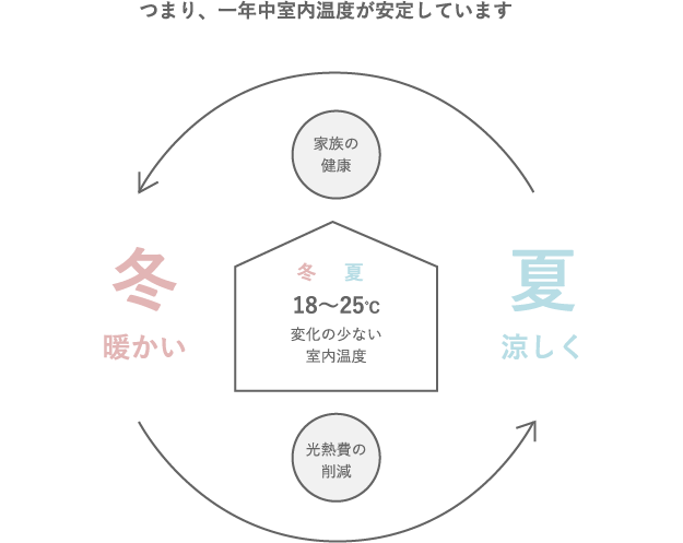 快適に住むための重要な条件の一つは、安定的な室内温度。スタイルボックスは高い断熱性能を誇り、外気の影響を受けにくく、夏は涼しく、冬は暖かい、魔法瓶のような家を実現しています。室内温度が安定することで、家族が病気になりにくくなり、エアコンやその他の冷暖房器具の使用頻度が減ることで光熱費の削減ができます。